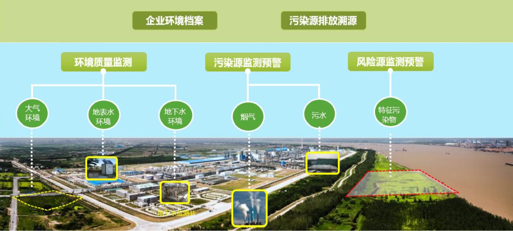 實(shi)現園區空氣(qi)質量(liang),水(shui)質量(liang),地下水(shui),土壤監測;企業污染源實(shi)時(shi)監測;危廢(fei)暫存區域(yu)視頻監控