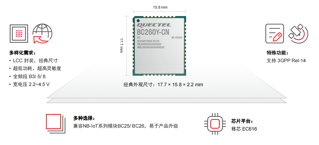 BC260Y-CN 采用更易(yi)于焊接的 LCC 封裝,可(ke)(ke)通過(guo)標準(zhun) SMT 設備實現模塊的快速(su)生(sheng)產,為(wei)客戶提供(gong)可(ke)(ke)靠的連接方式(shi),并滿足復雜環境(jing)下的應用需求(qiu)。
