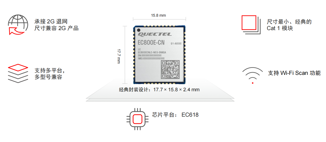 EC800E-CN 是移远通信专(zhuan)为 M2M 和 IoT 领(ling)域而设(she)计的 LTE Cat 1 无线通信模块,支持最大下(xia)行速率 10 Mbps 和最大上行速率 5 Mbps,超(chao)小封装,超(chao)高(gao)性价比。同时,EC800E-CN 在封装上兼容 EC800M-CN、EC800N-CN 和EC800G-CN 模块。